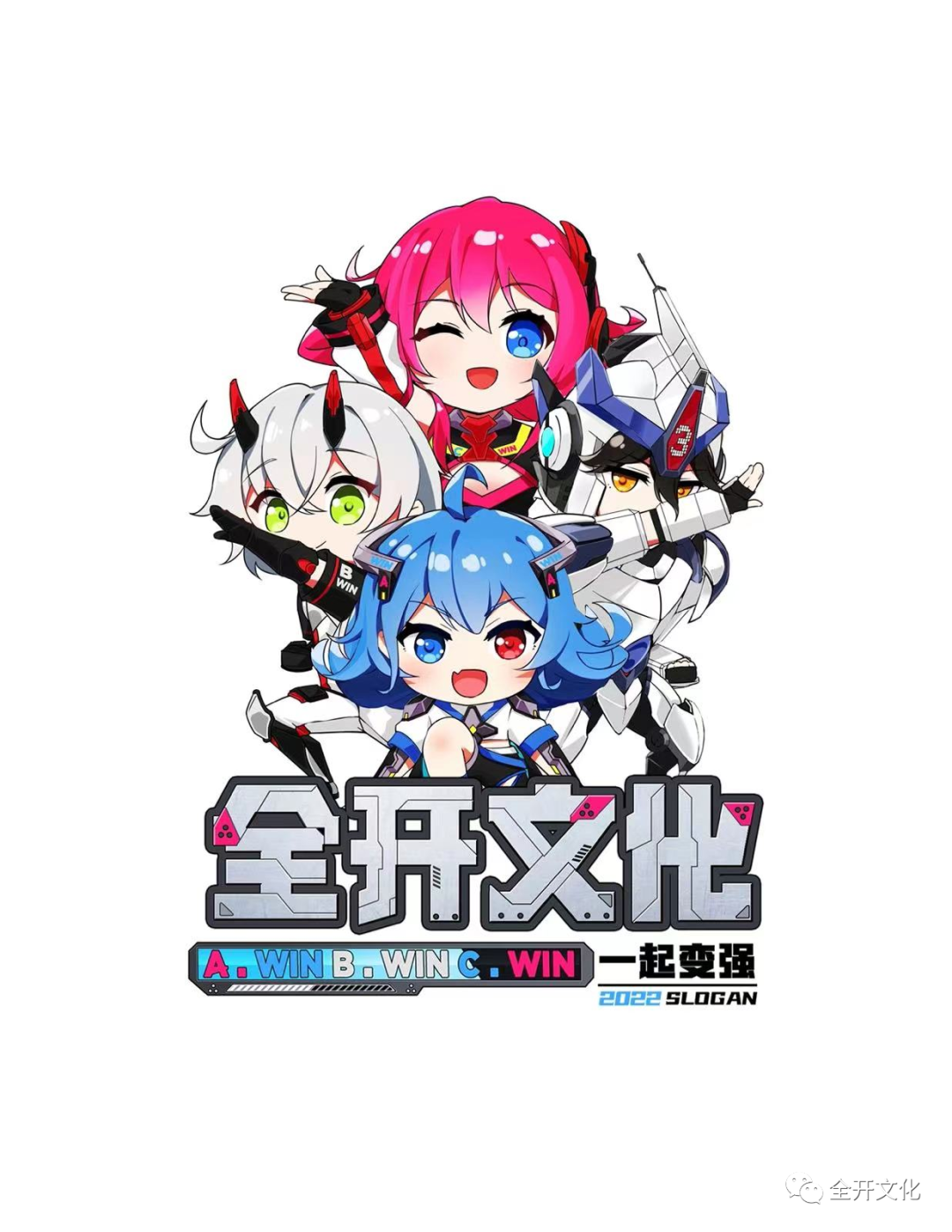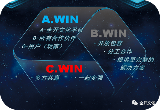 它的標志由“A、B、C、WIN”組合而成,A表示平臺,B表示全開文化所有合作伙伴,C表示用戶(玩家)。A WIN、B WIN、C WIN意在傳遞通過平臺最終實現(xiàn)多方共贏、一起變強!