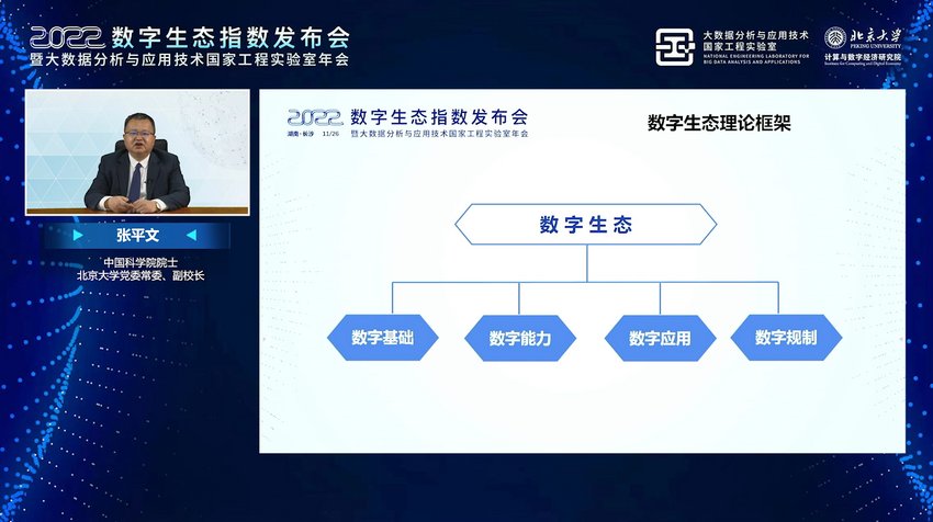 2022年11月26日,數(shù)字生態(tài)指數(shù)2022發(fā)布會暨大數(shù)據(jù)分析與應(yīng)用技術(shù)國家工程實驗室年會在線上成功舉辦,本次大會由北京大學(xué)大數(shù)據(jù)分析與應(yīng)用技術(shù)國家工程實驗室聯(lián)合長沙市科學(xué)技術(shù)局、湖南湘江新區(qū)科技創(chuàng)新和產(chǎn)業(yè)促進局主辦,北京大學(xué)計算與數(shù)字經(jīng)濟研究院承辦。院士專家、政府領(lǐng)導(dǎo)、企業(yè)機構(gòu)權(quán)威人士等重量級嘉賓匯聚云端、共襄盛舉,共同見證《數(shù)字生態(tài)指數(shù)2022》發(fā)布。湖南省發(fā)展和改革委員會黨組成員、副主任文會中,湖南湘江新區(qū)(長沙高新區(qū))黨工委委員、管委會副主任郭力夫為大會致辭,北京大學(xué)黨委常委、副校長張平文院士,東北大學(xué)黨委常委、副校長唐立新院士等專家出席會議。會上,多項重磅報告發(fā)布,湖南算力網(wǎng)絡(luò)融合協(xié)同創(chuàng)新平臺正式啟動,并特邀業(yè)界專家作主題報告,共創(chuàng)數(shù)字經(jīng)濟發(fā)展的美好前景。